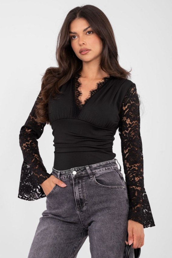 Eleganckie body wykonane z połączenia poliestru i elastanu, łączące wygodę z wyrafinowanym stylem. Model o standardowej długości z dekoltem w serek podkreśla sylwetkę i nadaje całości subtelnie kobiecy charakter. Długi, rozkloszowany rękaw z koronki dodaje lekkości i elegancji, a ozdobne marszczenia na materiale na przodzie stanowią stylowy detal, który wyróżnia body. Wysoką funkcjonalność zapewniają wszyte, usztywniane miseczki oraz praktyczne zapięcie na haftki, ułatwiające zakładanie i zdejmowanie. Dominujący gładki wzór sprawia, że body jest uniwersalne i idealne zarówno na wyjątkowe okazje, jak i do eleganckich codziennych stylizacji.