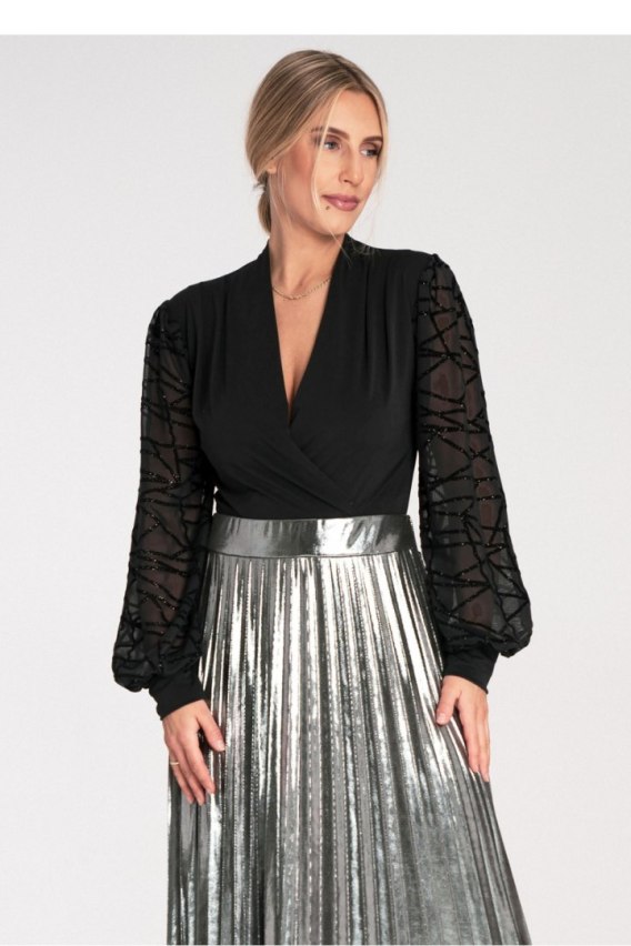 Body z kopertowym dekoltem w serek, które subtelnie podkreśla sylwetkę. Ozdobne, długie rękawy dodają mu elegancji i wyjątkowego charakteru, tworząc stylowy i kobiecy element garderoby.
