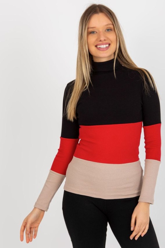Sweter damski z długim rękawem oraz golfem. Sweter wykonany z prążkowanej tkaniny w trzech kolorach.