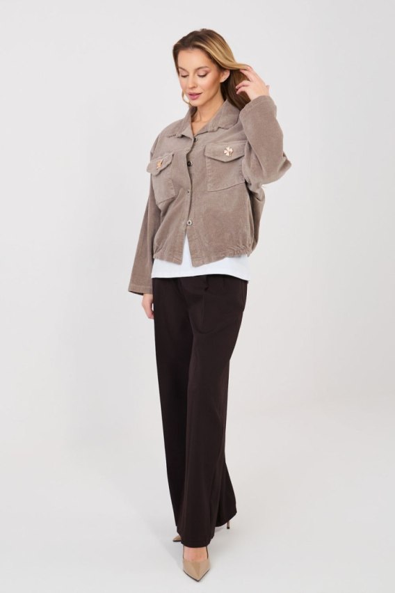 Nowoczesna, damska kurtka sztruksowa w stylu casual, idealna na codzienne, przejściowe dni. Ten model łączy klasyczny fason bomberki z modnym, lekko retro wykończeniem, tworząc uniwersalną propozycję do wielu stylizacji. Kurtka wykonana jest z wysokiej jakości bawełny z dodatkiem elastanu, co zapewnia komfort noszenia i delikatną elastyczność materiału. Posiada gładki wzór, krótki fason oraz długi rękaw, który nadaje lekkości i nowoczesnego charakteru. Praktyczne kieszenie z patkami na przodzie pozwalają wygodnie przechowywać drobiazgi, a zapięcie na guziki oraz u dołu wszyta guma zapewniają dopasowanie i wygodę noszenia. Dodatkowym atutem są odpinane ozdobne broszki, które pozwalają spersonalizować wygląd kurtki. Model wykończono klasycznym kołnierzykiem, co podkreśla elegancki charakter bomberki, jednocześnie zachowując casualowy, swobodny styl. To idealny wybór dla kobiet szukających praktycznej, a zarazem stylowej kurtki na wiosnę czy jesień.