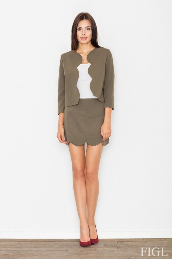 Nietuzinkowy komplet składający się z żakietu i mini spódnicy. Żakiet bez zapięcia z rękawem 3/4, spódnica mini dopełnia całość. Idealna propozycja na wiele okazji.