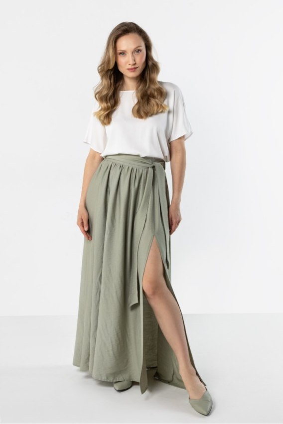 Zwiewna spódnica maxi o kobiecym fasonie, która łączy wygodę i styl. Wysoki stan podkreśla talię, a szerokie wiązanie dodaje eleganckiego charakteru. Rozcięcie z przodu subtelnie eksponuje nogę i nadaje lekkości, a elastyczna gumka z tyłu pasa zapewnia komfortowe dopasowanie. Model idealny na co dzień i na letnie stylizacje.