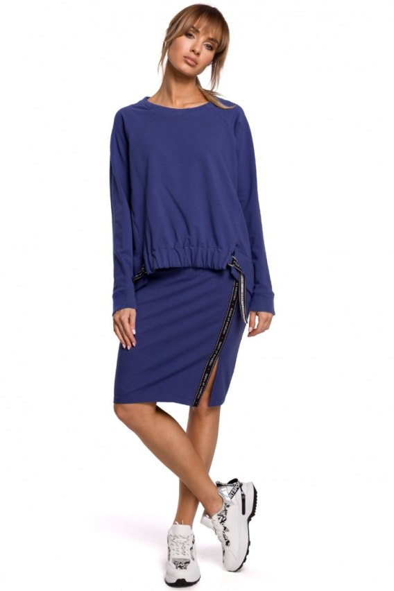 Spódnica o ołówkowym kroju w sportowej odsłonie, uszyta z dzianiny dresowej, elastyczna i komfortowa, z modnym lampasem z napisami i lekkim rozcięciem na udzie. Spódnica z guma w pasie.