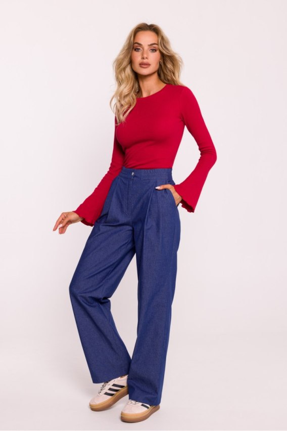 Stylowe spodnie damskie wykonane z wysokiej jakości tkaniny bawełnianej. Charakteryzują się szerokimi nogawkami, które zapewniają wygodę i elegancki wygląd, oraz zaszewkami w talii, które subtelnie podkreślają sylwetkę. W pasie znajduje się elastyczna guma, co gwarantuje komfort i idealne dopasowanie. Spodnie zapinane są na napę oraz rozporek, co dodaje praktyczności. Boczne kieszenie wsuwane oferują dodatkową funkcjonalność. Zaprojektowane i uszyte w Polsce, łączą nowoczesny design z doskonałym rzemiosłem.