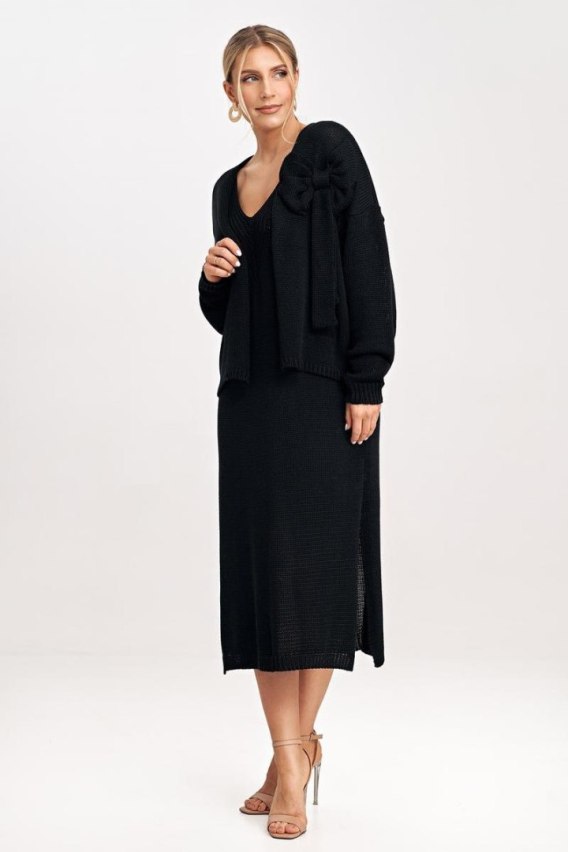 Komplet dwuczęściowy składający się z midi sukienki oraz bolerka. Bolerko z długim rękawem, niezapinane z ozdobną kokardą na przodzie. Sukienka na grubych ramiączkach oraz głębokim dekoltem.