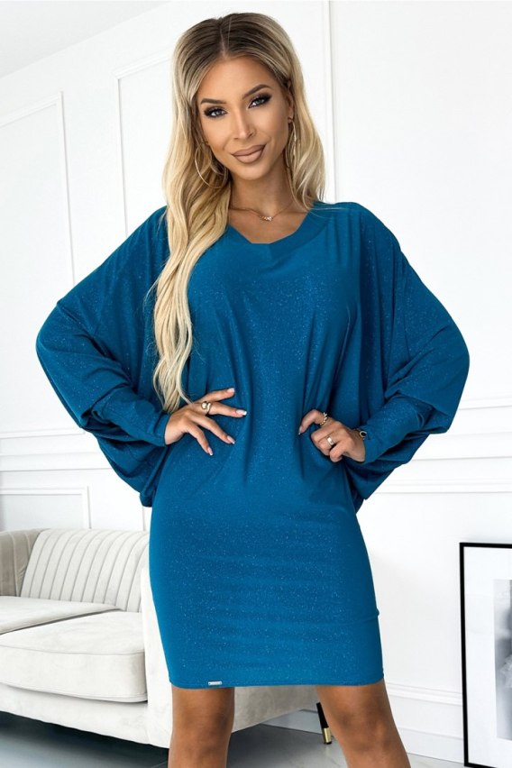 Sukienka nietoperz z dekoltem. Uszyta z elastycznego materiału z brokatem. Można ją nosić prosto lub zbluzowaną. Sukienka w kolorze morskim. Marka numoco. Produkcja polska.