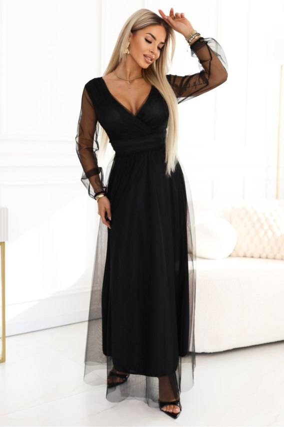 Są wieczory, w których nie chcesz krzyczeć stylizacją. Chcesz wejść cicho i sprawić, że wszyscy odwrócą głowy. Ta czarna sukienka jest elegancka jak klasyka, ale ma w sobie miękki, zmysłowy ruch. Lekka tiulowa warstwa płynie przy każdym kroku, a Ty czujesz, że wreszcie masz na sobie coś, co wygląda jak pewność siebie. Góra z dekoltem V pięknie wysmukla szyję i podkreśla linię biustu. Długie transparentne rękawy dodają efektu wow w bardzo dopracowany sposób, a tył z głębokim wycięciem odkrywa plecy tak, jak lubisz: subtelnie, ale z charakterem. W talii pojawia się wiązanie, które domyka całość w najbardziej kobiecy sposób. To sukienka wieczorowa, która robi klimat zanim jeszcze zacznie się pierwszy toast. Idealna jako sukienka na wesele, przyjęcie, galę, studniówkę, sylwestra i każdą okazję, kiedy ma być elegancko, ale nie sztywno. Jeśli szukasz kreacji, która robi wrażenie to właśnie ją znalazłaś. Produkcja europejska.