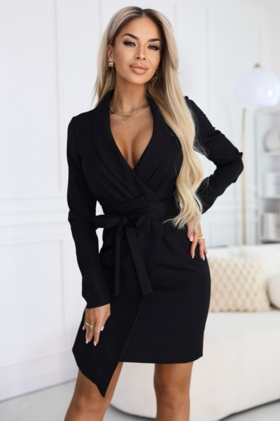 Wyobraź sobie poranek, gdy masz spotkanie, a po pracy planujesz kolację w mieście. Ta sukienka marynarkowa pozwala prosto stworzyć elegancki look, wystarczy dobrać szpilki lub botki i małą torebkę. Klasyczna czarna sukienka sprawdzi się wtedy, gdy chcesz wyglądać elegancko i czuć się wygodnie. Model ma kopertowy dekolt w serek oraz klapy w stylu marynarki, które ładnie układają się przy biuście. Długie rękawy i wiązany pasek w talii pomagają dopasować fason do sylwetki. Dół wyróżnia się asymetryczną spódnicą z efektownym wykończeniem z przodu, długość przed kolano pasuje na wiele okazji. Produkcja polska.