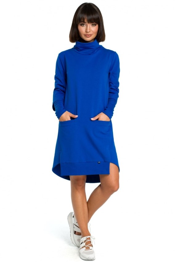 Asymetryczny nowoczesny krój z wysoką stójką pod szyją, rozcięciami po bokach i dodatkowymi wciąganymi rękawkami ze ściągacza, a przy tym wygodny, luźny fason, który sprawdzi się na co dzień. Sukienka posiada na przodzie funkcjonalne kieszenie.
