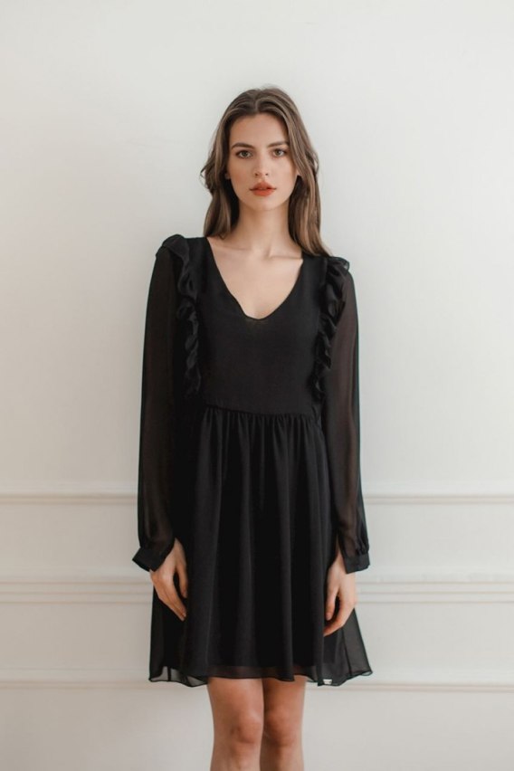 Czarna luźna zwiewna szyfonowa sukienka midi z długim marszczonym rękawem z mankietem, zapinanym na guzik. Dekolt w serek. Z przodu i z tyłu wszyte ozdobne pionowe falbany. Marszczona w pasie. Bez zapięcia. Dół sukienki z halką.