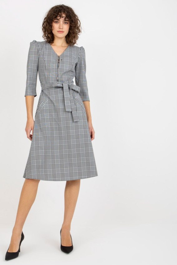 Sukienka w kratę, zapinana na zamek z wiązaniem w pasie. Sukienka z rękawem 3/4 oraz kieszeniami wsuwanymi.