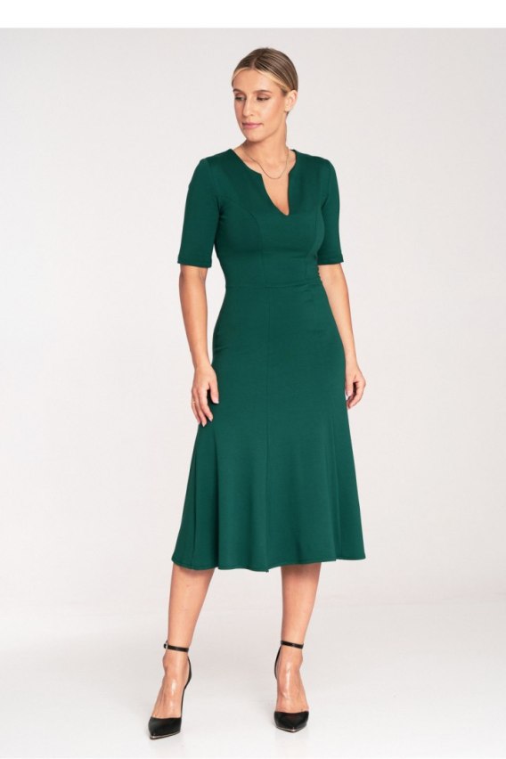 Sukienka o długości midi wykonana z klinów. Sukienka posiada dekolt w kształcie litery V, rękaw o długości 3/4. Zapinana z boku na zamek. Idealna na wiele okazji.