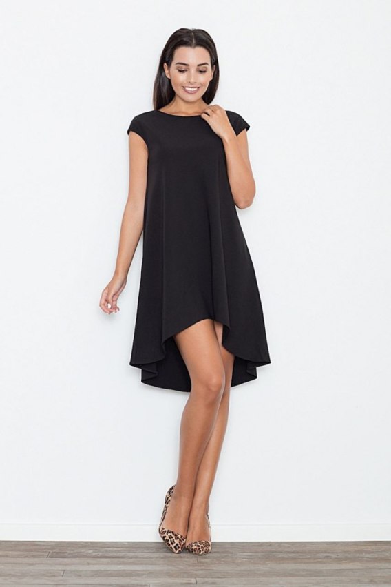 Elegancka, luźna sukienka o asymetrycznym kroju. Wykonana ze zwiewnego materiału, zapinana na zamek.