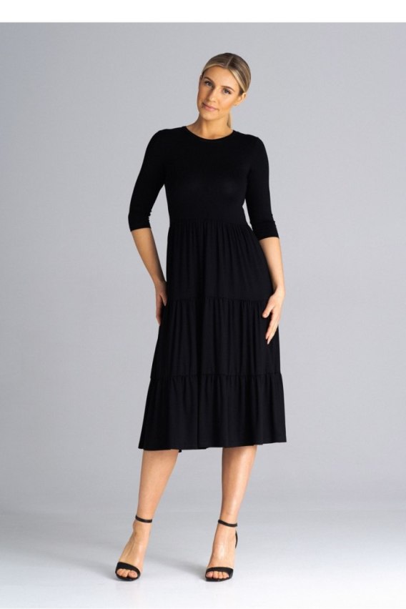 Sukienka midi z rękawem 3/4, w pasie dopasowana. Od pasa w dół trzy marszczone falbany. Sukienka zakładana przez głowę.