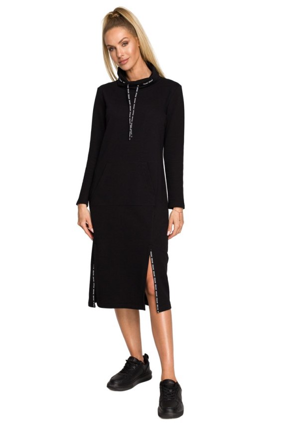 Ta sukienka to must have wielbicielek dobrego stylu, ale i komfortu na co dzień. Przyjemna dzianina o ciekawym splocie i dodatki, lampasy z logo w rozcięciach na przodzie i sznurek w wysokim kołnierzu przepleciony przez oczka. Prosty fason i długość midi pasują na każdą sylwetkę i są wygodne w domu, w pracy i na wakacjach.