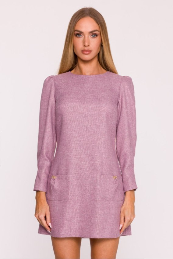 Elegancka sukienka z tkaniny tweedowej w melanżowym wzorze to propozycja łącząca klasyczny szyk z dziewczęcym wdziękiem. Strukturalny materiał pięknie układa się na sylwetce, a jego charakterystyczna faktura nadaje całości wyrazistego stylu. Model z dekoltem w kształcie łódki i długimi rękawami marszczonymi na ramionach prezentuje się subtelnie i kobieco. Zaszewki u dołu rękawów dodają im eleganckiej formy, a kryty zamek z tyłu zapewnia wygodę i estetyczne wykończenie. Na przodzie umieszczono naszywane kieszenie ozdobione biżuteryjnymi kokardkami, które przełamują klasyczną linię fasonu i wprowadzają efektowny, dekoracyjny akcent. Trapezowy krój, delikatnie dopasowany w ramionach i swobodny w biodrach, gwarantuje komfort noszenia i piękną, harmonijną sylwetkę. Mini długość nadaje sukience lekkości i nowoczesnego charakteru. Zaprojektowana i uszyta w Polsce idealna dla kobiet, które cenią elegancję z nutą oryginalnych detali.