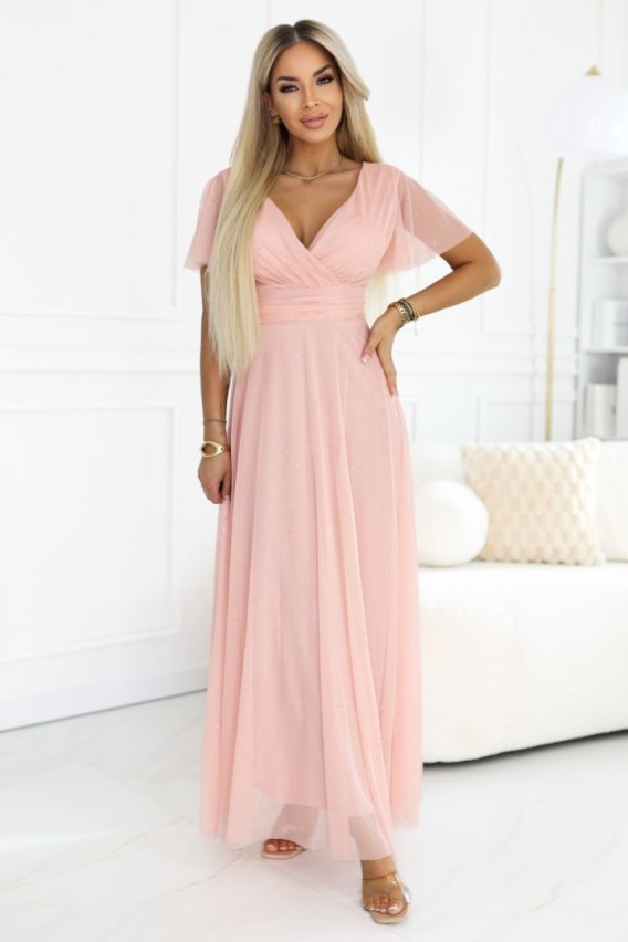 Ta brzoskwiniowa sukienka maxi z delikatnym połyskiem daje efekt wow od pierwszej chwili - wysmukla sylwetkę, podkreśla talię i pięknie pracuje w ruchu. Kopertowy dekolt V dodaje lekkości górze, a zwiewne rękawki miękko układają się na ramionach. Idealna, gdy chcesz wyglądać elegancko, a jednocześnie czuć się swobodnie przez cały dzień i wieczór. Brzoskwiniowa, tiulowa sukienka maxi z kopertowym dekoltem i subtelnym brokatowym połyskiem pięknie podkreśla talię i zachwyca lekkością w ruchu. Idealna na wesele, bal, studniówkę i eleganckie przyjęcia. Produkcja europejska.