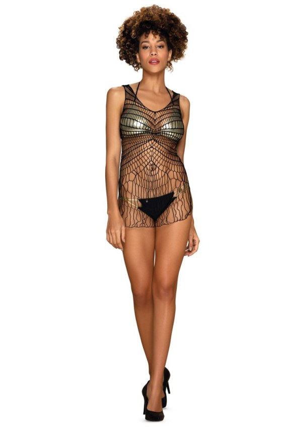 Ażurowa sukienka D607 idealna zarówno jako element ozdobny na ciało, do sypialni, bądź też jako finezyjne dopełnienie plażowego Looku. Wykonana z czarnej, elastycznej przędzy, z wycięciami po bokach.