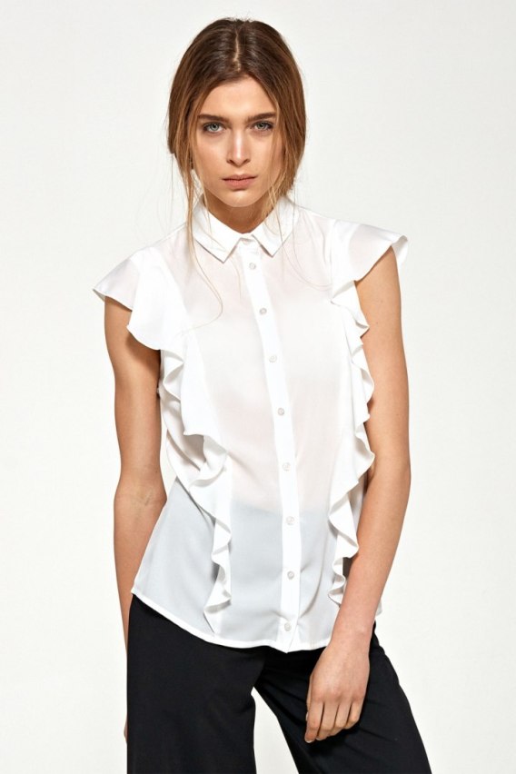 Ten model to HIT kolekcji wiosna-lato! Wyjątkowa i urocza koszula bez rękawów z kołnierzykiem, którą zdobią najmodniejsze w tym sezonie falbany! W ciepłe dni model ten idealnie sprawdzi się w pracy oraz podczas niezobowiązujących wyjść.