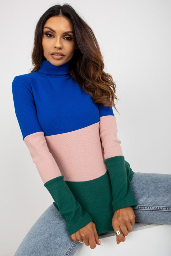 Sweter damski z długim rękawem oraz golfem. Sweter wykonany z prążkowanej tkaniny w trzech kolorach.