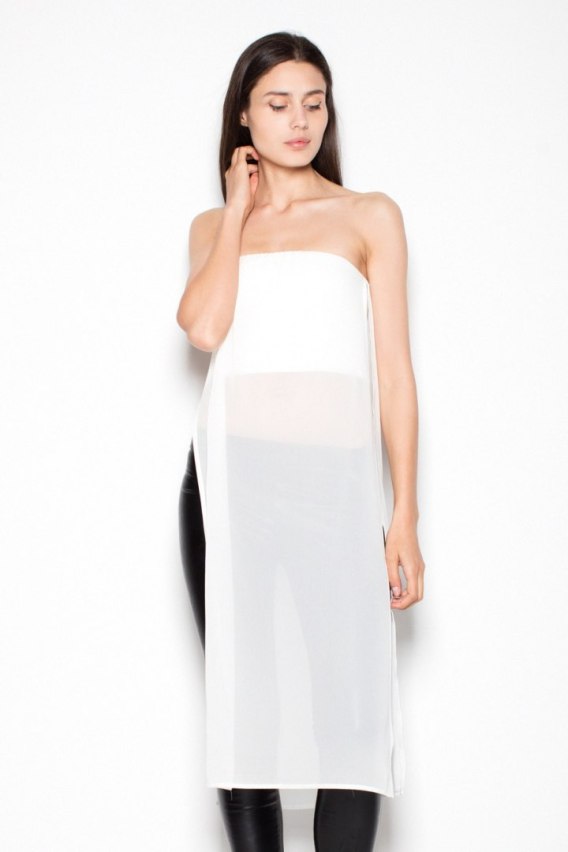 Ekstrawagancki top bez ramiączek przedłużany ozdobnym szyfonem. Po bokach posiada wcięcia. Model o oryginalnym kroju, dobrze prezentuje się z dopasowanymi legginsami.