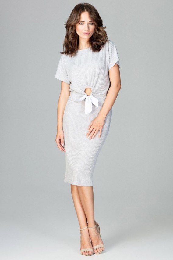 Wyjątkowy komplet krótka bluzka ze spódnicą to modny look tego sezonu. Opadająca bluzka na ramię z wiązaniem na kokardkę, spódnica dopasowana za kolano. Fason opływa sylwetkę nadając jej kobiecego charakteru.