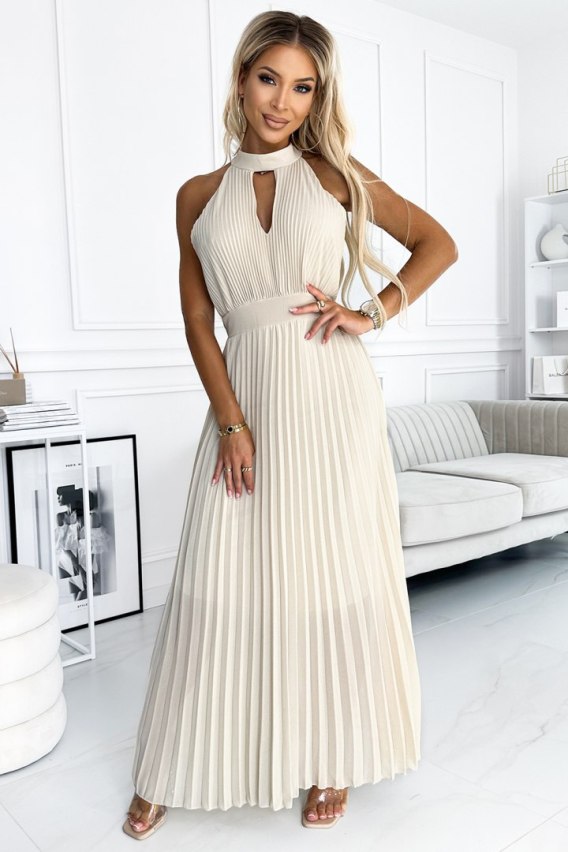 Plisowana szyfonowa sukienka midi z wycięciem w kształcie łezki na dekolcie, oraz głębokim dekoltem na plecach. Sukienka w kolorze beżowym. Marka numoco. Produkcja europejska.