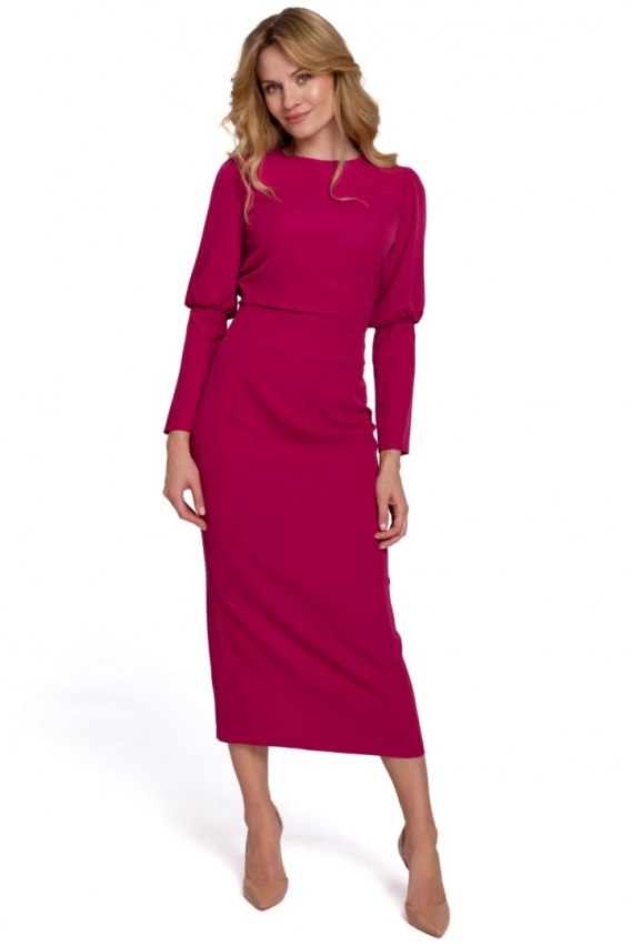 Elegancja w najlepszym wydaniu. Lekko zbluzowana góra, długi ołówkowy dół, gruby pasek w talii i bufiaste rękawy z długimi dopasowanymi mankietami tworzą fason podkreślający walory sylwetki. Rozcięcie na plecach dodaje jej szyku i sprawia, że jest to sukienka od której ciężko oderwać wzrok. Sukienka zapinana na kryty zamek.