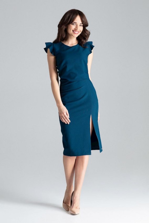 Koktajlowa sukienka za kolano z rozcięciem z przodu. Na rękawach ozdobne falbany, marszczenie po prawej stronie dodaje szyku i elegancji. Model bez podszewki, zapinana z tyłu na kryty zamek. Idealna na biznesowe spotkanie lub na ważną kolację.