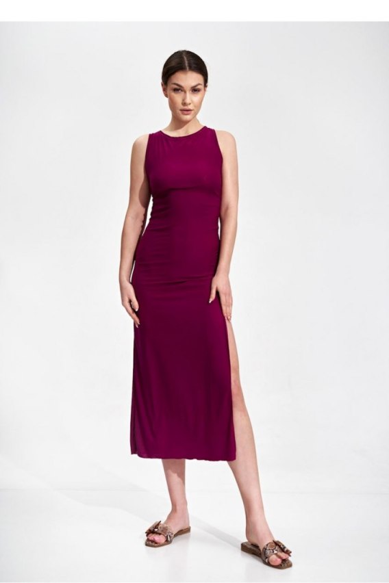 Dopasowana sukienka midi z elastycznej tkaniny. Na plecach głęboki wiązany dekolt, gładki przód z półokrągłym dekoltem, rozcięcie z boku. Sukienka bez podszewki oraz zapięcia.