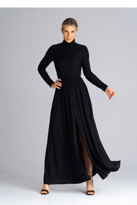 Sukienka maxi, z golfem, z długim rękawem, góra dopasowana, w pasie marszczona, od pasa w dół rozkloszowana z pęknięciem z przodu