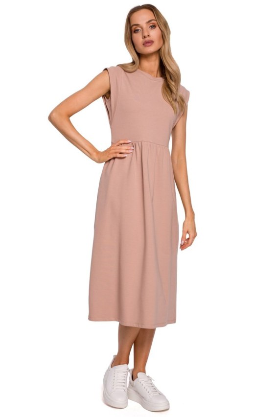 Sukienka z dzianiny o długości midi. Odcinana w pasie z podwyższoną talią i luźną spódnicą, optycznie zwęża talię, a dzięki prostemu krojowi dodatkowo wysmukla całą sylwetkę. Posiada charakterystyczne, bardzo krótkie rękawki oraz zabudowany dekolt. Świetnie sprawdzi się zarówno na co dzień, jak i jako sukienka wizytowa.