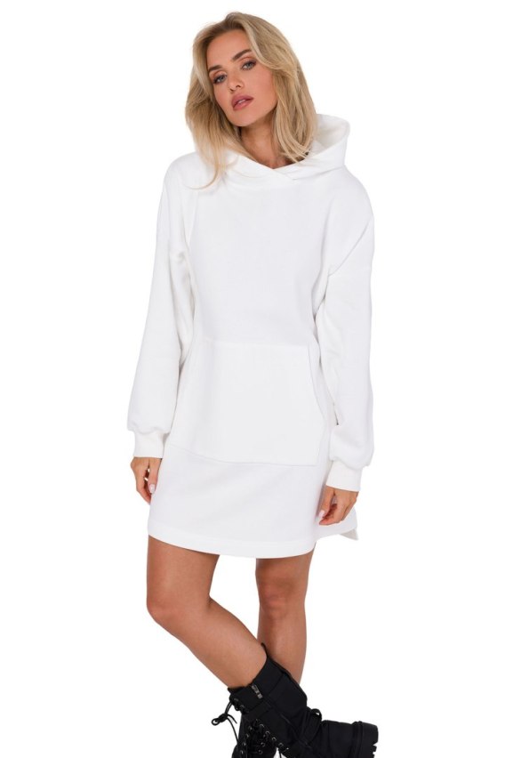 Sukienka z dzianiny z długim rękawem oraz kapturem. Tył sukienki lekko przedłużany, po bokach rozcięcia. Na przodzie kieszonka typu kangurek. Zaprojektowana i uszyta w Polsce.