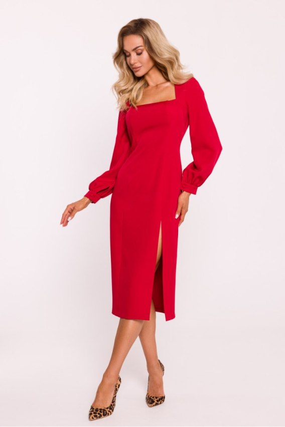 Sukienka midi z jednokolorowej tkaniny, o dopasowanym fasonie, doskonale podkreślającym sylwetkę. Elegancki dekolt typu karo dodaje jej klasycznego uroku, podczas gdy długie, bufiaste rękawy z mankietami zapinanymi na oblekany guzik wprowadzają romantyczny i nowoczesny akcent. Wysokie rozcięcie z przodu zapewnia zmysłowy detal, a kryty zamek z tyłu zapewnia komfortowe dopasowanie. Model nie posiada podszewki, co czyni go lżejszym i idealnym na różne okazje. Sukienka została zaprojektowana i uszyta w Polsce, co gwarantuje wysoką jakość oraz staranność wykonania.