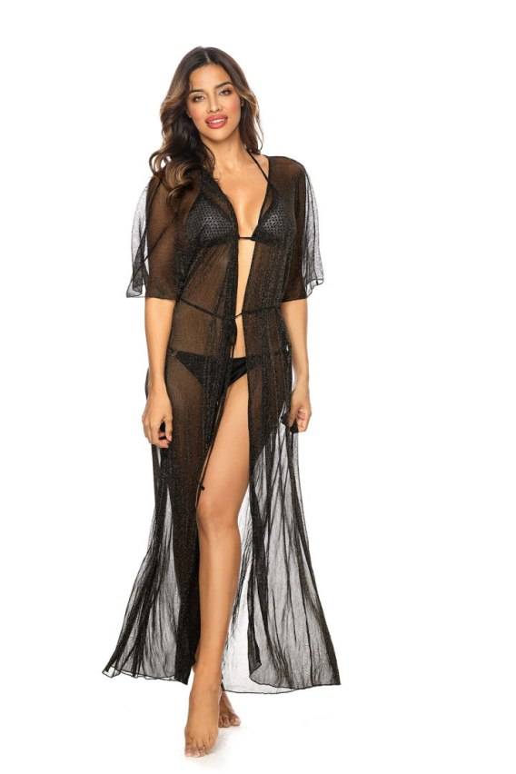 Elegancka, czarna tunika plażowa długa, z przewiewnego, prześwitującego materiału. Przewiewny strój damski na plażę który zaskoczy Cię swoim miękkim i eleganckim materiałem. Lekka niczym puch tunika otuli ciało i ochroni przed promieniami słońca. Seksownie lekko prześwitujący materiał zmysłowo wyeksponuje piękno kobiecego ciała i przyciągnie spojrzenia. Tunika plażowa z krótkim rękawem, wiązana z przodu. Szybkoschnąca.